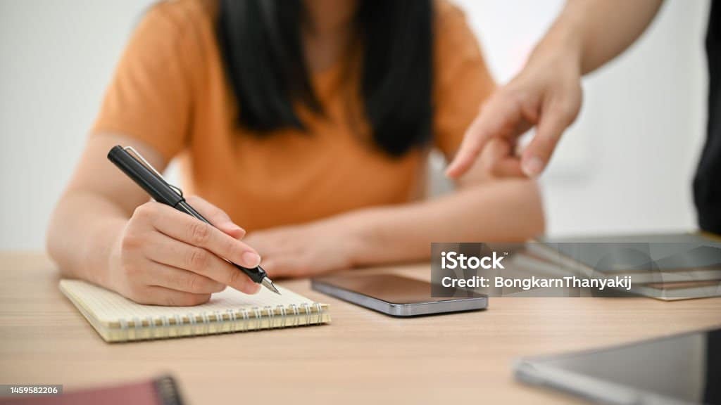 cropped shot, Young Asian female student is taking notes on her spiral notebook, studying, and being commanded by her teacher.